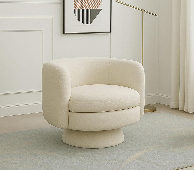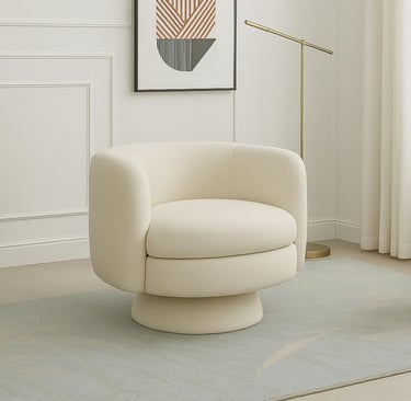 Sleek, sculptural, and irresistibly cozy. This white barrel chair brings soft sophistication to any space. Upholstered in a plush, texture fabric, it's the perfect accent for minimalist, Scandinavian, or luxe modern interiors.