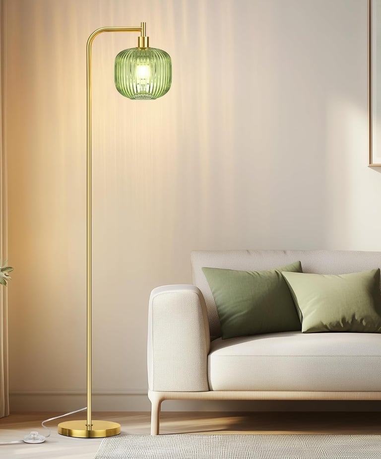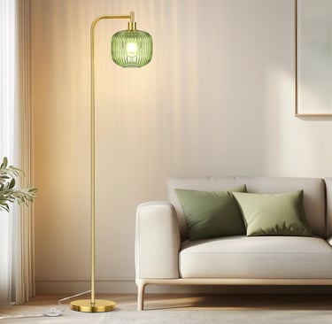 Add a touch of modern elegance with this sculptural floor lamp, featuring a ribbed green glass shade and sleek brushed gold base. The soft ambient glow creates a cozy yet stylish atmosphere-perfect for reading corners, living rooms, or bedroom nooks.