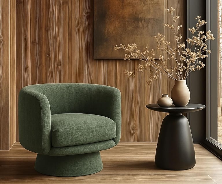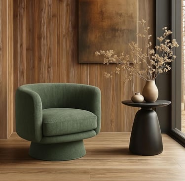Wrap yourself in comfort and style with this plush swivel accent chair. Upholstered in a rich forest green fabric. It is curved barrel design offers cozy support while the smooth swivel base adds function and flexibility. A perfect statement piece for modern, mid-century, or moody interiors.