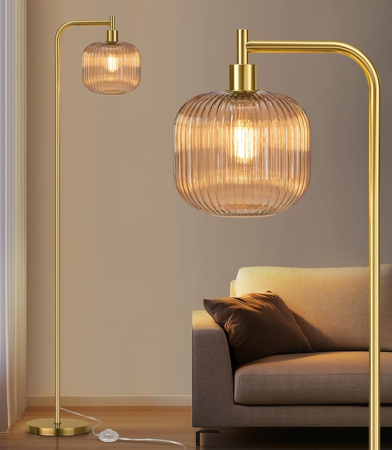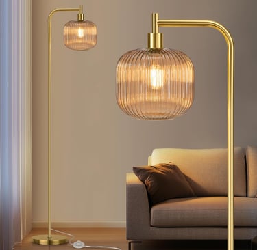 Warm up your space with this elegant floor lamp, featuring a ribbed champagne glass shade and curved brass arm. The soft, golden glow adds cozy, vintage-inspired charm to modern and classic interiors alike-perfect for living rooms, lounges, or reading nooks.