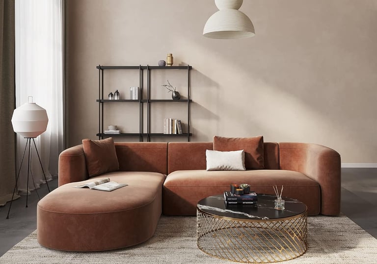Elevate your space with this luxurious rust-colored velvet sectional, featuring sleek, low-profile design and plush rounded ottoman. Perfect for modern or mid-century interiors, this set adds warmth and style while offering roomy, comfortable seating. Ideal for entertaining or relaxing in style.